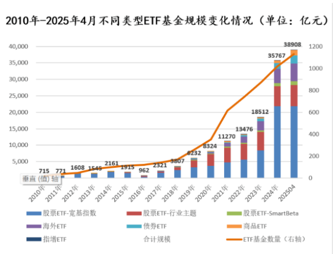 中国的ETF规模也疯狂,从0到1万亿,用了整整16年;从1万亿到2万亿,用了不到3年;从2万亿到4万亿,仅仅用了几个月。
