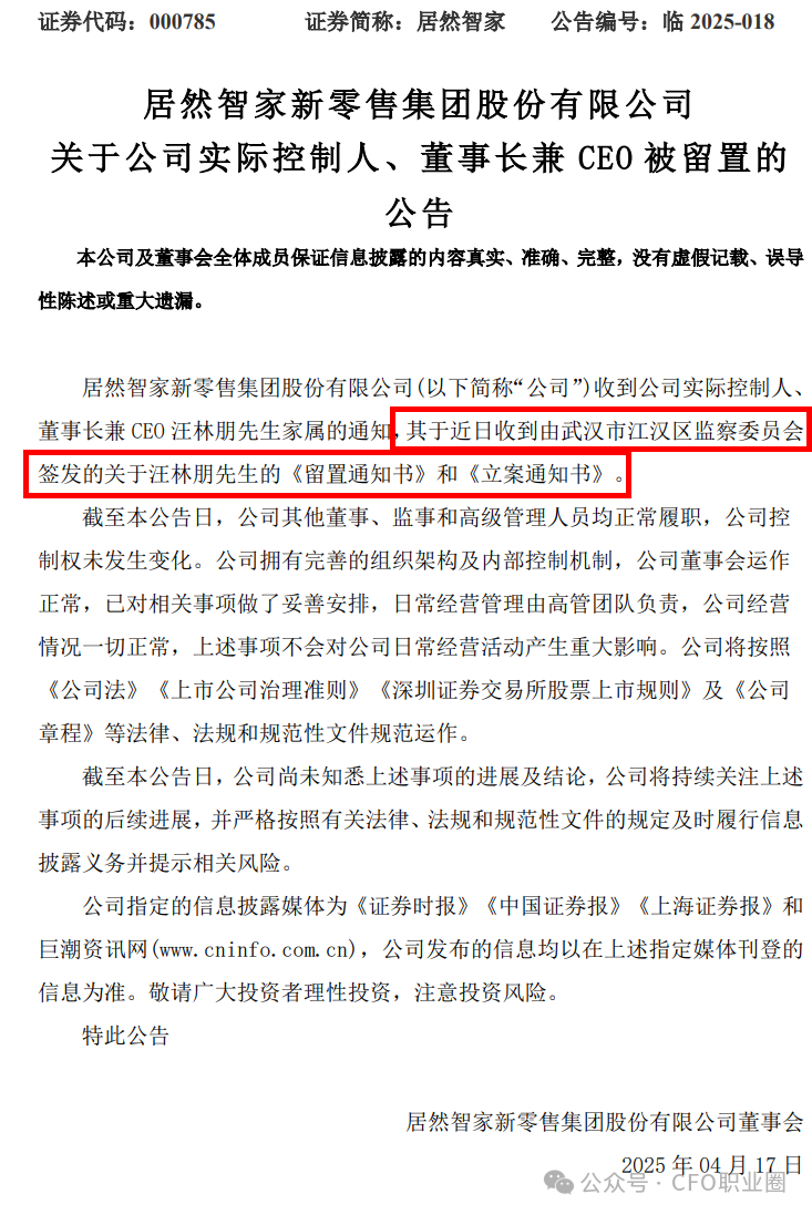 今年4月17日,居然智家发布公告,收到汪林朋家属的通知,其于近日收到由武汉市江汉区监察委员会签发的关于汪林朋的《留置通知书》和《立案通知书》。公司称,上述事项不会对公司日常经营活动产生重大影响。
