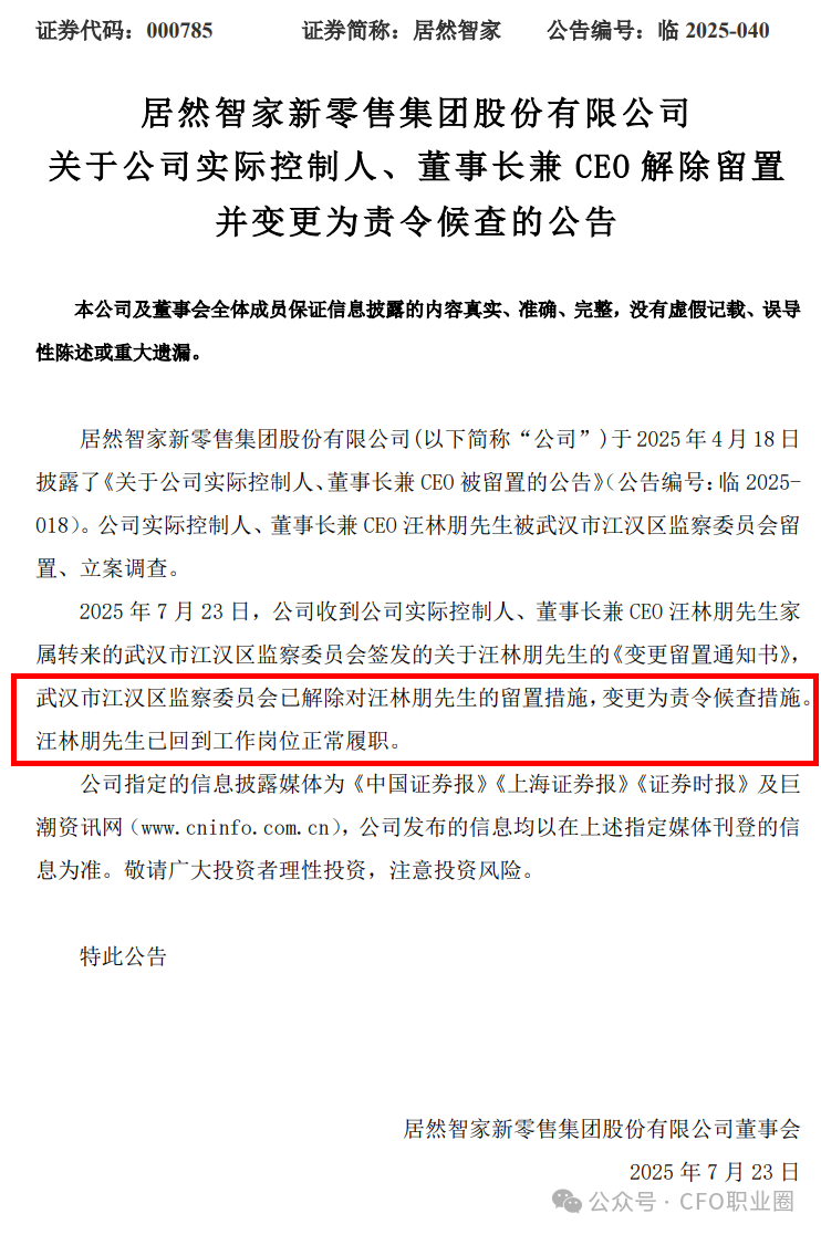 今年7月23日,居然智家公告收到汪林朋家属转来的武汉市江汉区监察委员会签发的关于汪林朋的《变更留置通知书》。对汪林朋的留置措施已解除,变更为责令候查措施。公司表示,汪林朋已回到工作岗位正常履职。