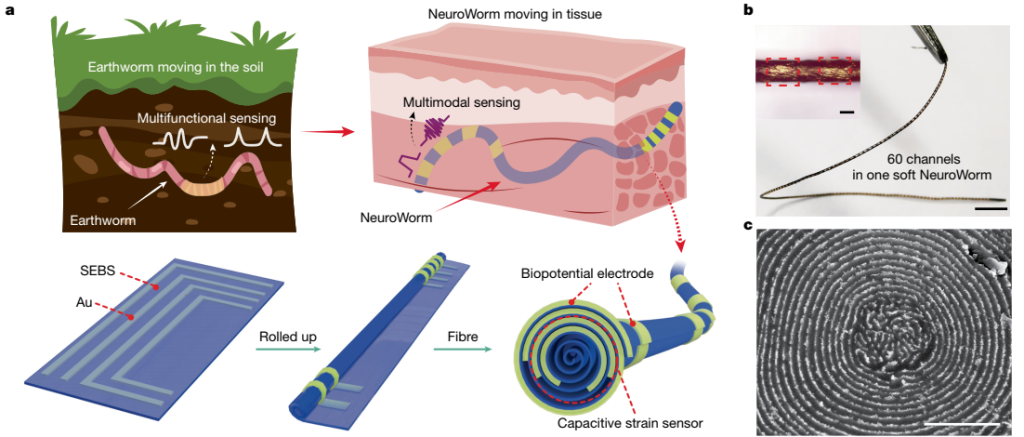 在大自然中,蚯蚓凭借独特的“体节”结构(metamerism),实现了高度分布式的感知与运动控制能力。每一节体段中都布有离散的感知与神经单元,能够精准地感知外界刺激并灵活响应,展现出在复杂环境中自由穿行的非凡适应性。正是从这一自然设计中汲取灵感,中国科学院深圳先进技术研究院的刘志远研究员联合严威研究员团队提出了NeuroWorm——一种仿蠕虫结构的动态、柔软、可拉伸的纤维神经接口。