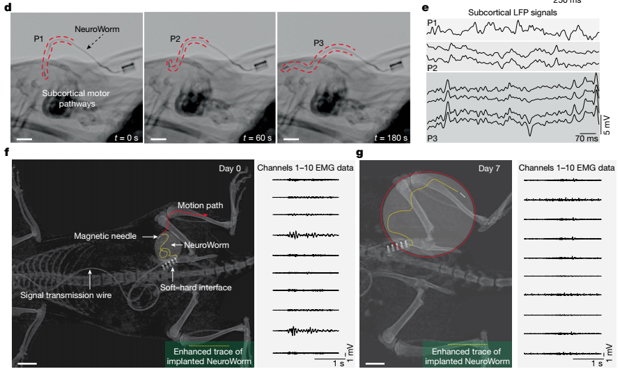 最关键的是“学会游走”:研究人员联合中国科学院深圳先进技术研究院的徐天添研究员团队创新性地引入开放式磁控策略,实现了NeuroWorm在组织内的初步可控推进与转向,使其在体内“听话”地游走。实验视频中,这根透明纤维如蚯蚓穿梭泥土般,从实验小白鼠的一个区域移动到另一区域,沿途留下清晰的神经信号记录,全程无需二次手术。纤维的能动性,得益于“磁控”黑科技。“它就像一个机器人在大脑和肌肉中漫游,全程无创,对人体无害。”严威解释道。