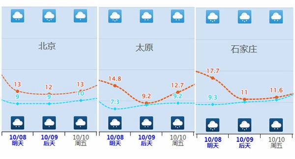 大城市当中,像太原、北京、天津、石家庄9日最高气温都只有10℃上下,较常年同期偏低10℃左右。