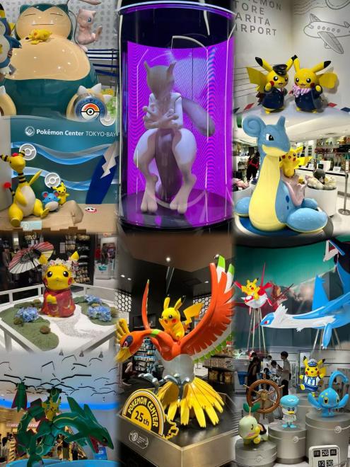 自从在横滨樱木町站,第一次从波加曼邮筒感受到打卡的幸福感后,我的圣地巡礼和集邮之旅便一发不可收拾。各地的宝可梦中心入口处都设置了符合城市特征的雕塑:在涩谷Parco,有在机能皿中抱臂沉眠的超梦;日本桥的东京宝可梦中心DX则还原了“大肚上睡”造型、无比治愈的卡比兽和梦幻;行至东京湾,电龙与玛力露带来了海滨特有的冲浪活力;关东关西各个航站楼间,机长与空姐限定造型的皮卡丘,正亲切地向每一段飞行致意。在福冈宝可梦中心,我还见到过儿时最爱剧场版里的水都兄妹,想必他们正怀揣着庆典般的心情,日夜守护着福冈城吧。