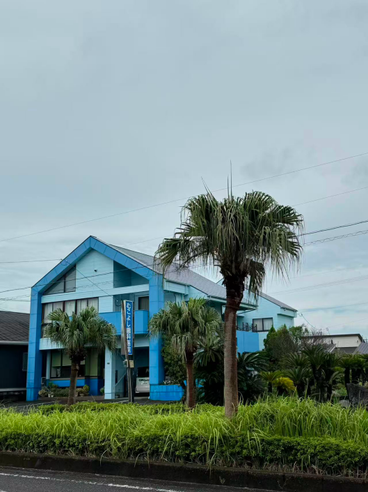 大半段脚程走下来,感觉指宿像一座虚拟小镇。当天是周一,天色稍阴,街道宽阔,几乎见不到居民的影子。营业的商铺不多,鲜见便利店,独立建筑都以水蓝、青绿、亮橙的漆色出现在视野里,植株是类似棕榈的高大树种。时间过午,才遇到几撮黄帽小学生,紧张地说了“こんにちは”(你好)后结伴跑过铁轨,方书包上的伊布挂件弹跳着缩小。