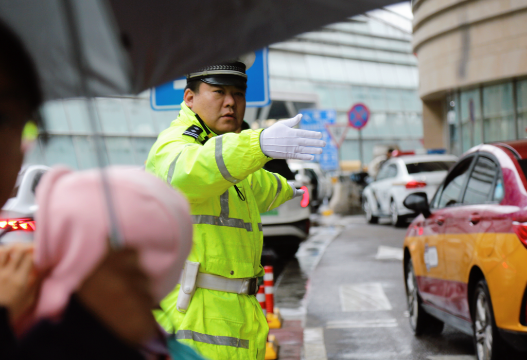 10月8日,“双节”假期返程迎来高峰,北京铁警在雨中强化北京南站站区周边交通疏导,护航旅客平安返京。受访单位 供图