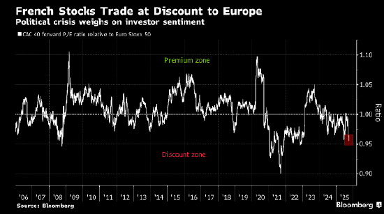 周一法国市场大跌,此前勒科尔尼突然辞职,因其未能在高度分裂的议会中促成一项获得足够支持的预算案。该国国债利差当时扩大至近90个基点,创今年以来最宽水平。