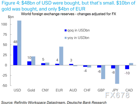 与此同时,最新Cofer数据显示,考虑美元大幅贬值因素后,各国央行在第二季实际上仍为美元储备净买家。德意志银行分析师估计,各国央行当季购买的美元计价证券(其中大部分是美债)接近500亿美元。