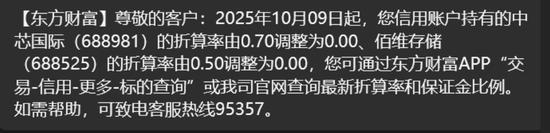 在东方财富证券App上,中芯国际折算率已经调整为0,生效日期为10月9日。