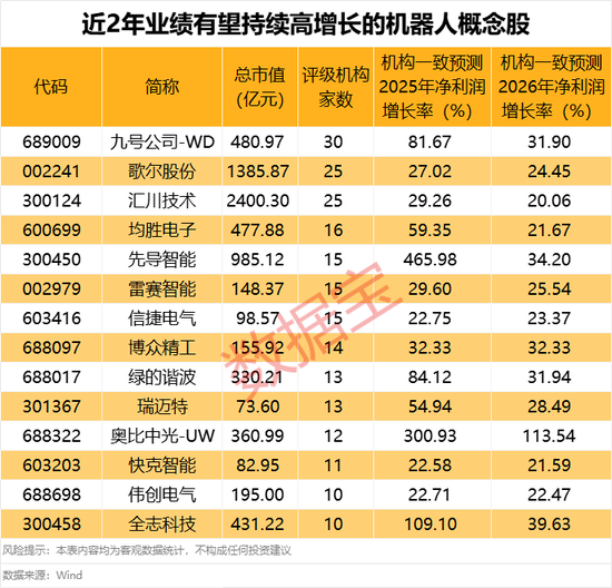 从业绩预期来看,14只概念股获得至少10家机构给予评级,且机构一致预测2025年和2026年公司业绩有望持续增长超20%。