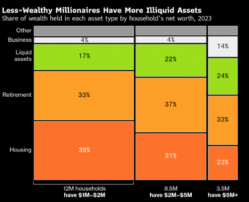 要实现消费自由,百万富翁通常需要更雄厚的资产。2023年,净资产达500万美元及以上的家庭中,约24%的财富以银行或经纪账户形式存在,流动性更强;而临近百万门槛的家庭中,该比例仅为17%。