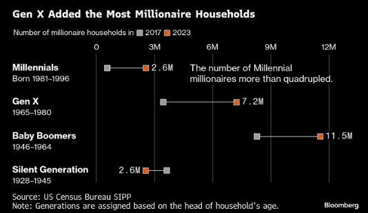 各代百万富翁数量及其财富分配存在显著差异。随着沉默一代逐渐离世,仅1946年前出生的百万富翁数量出现下滑。与此同时,年长一代美国人拥有更充裕的时间积累401(k)或IRA养老金储备,通常可在60岁生日前六个月开始自由提取。彭博分析显示,千禧一代百万富翁仅将约27%财富配置于退休账户,而婴儿潮一代百万富翁的该比例为37%。