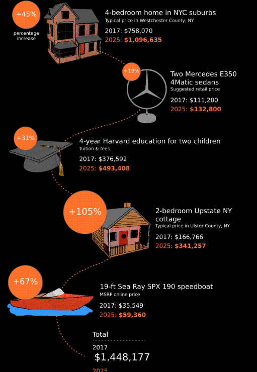 以纽约富裕家庭的消费标准为例:四居室住宅、两辆崭新的奔驰轿车、两个孩子的常春藤盟校教育、州内小型度假屋及一艘19英尺快艇。不到十年前,这套组合价值约140万美元;到2023年,相同配置已涨至210万美元。