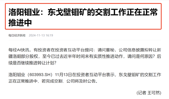2024年11月13日,洛阳钼业(603993)在投资者互动平台表示,东戈壁钼矿的交割工作正在正常推进中,若完成交割,公司将及时公告。