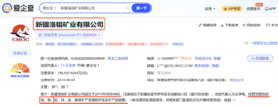 公开信息显示,新疆洛钼矿业有限公司成立于2010年,注册资本为15.05亿元。当前,洛阳钼业(603993)持有新疆洛钼矿业有限公司65.1%的股权,为后者的控股股东。此外,河南豫矿鑫源矿业有限公司和新疆维吾尔自治区哈密市国有资产投资经营有限公司分别持有新疆洛钼矿业有限公司27.9%和7%的股权。