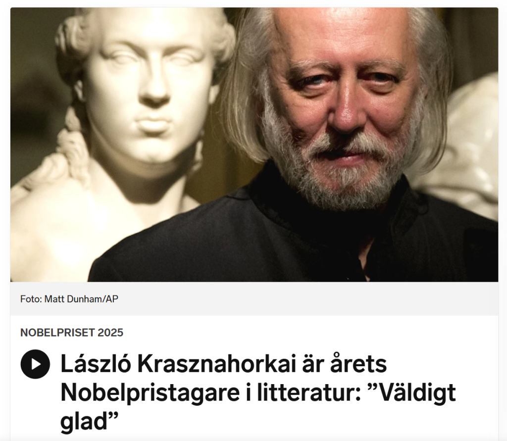 当地时间10月9日,瑞典学院将2025年诺贝尔文学奖颁给了匈牙利作家拉斯洛·卡撒兹纳霍凯,以表彰其“在末世恐惧中仍能通过震撼人心且具先知般洞察力的作品,重申艺术力量”的杰出成就。
