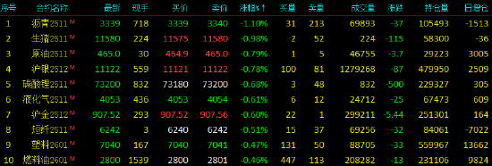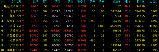 2025年10月10日,早盘开盘,国内期货主力合约涨多跌少。集运欧线涨超3%,、涨近2%,、、、多晶硅涨超1%,涨近1%;跌幅方面,SC、跌近1%。