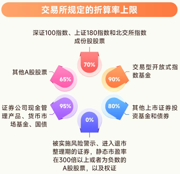 一是上证180指数成份股股票的折算率最高不超过70%,其他A股股票折算率最高不超过65%;二是交易型开放式指数基金折算率最高不超过90%;三是证券公司现金管理产品、货币市场基金、国债折算率最高不超过95%;四是被实施风险警示、进入退市整理期的证券,静态市盈率在300倍以上或者为负数的A股股票,以及权证的折算率为0%;五是其他上市证券投资基金和债券折算率最高不超过80%。