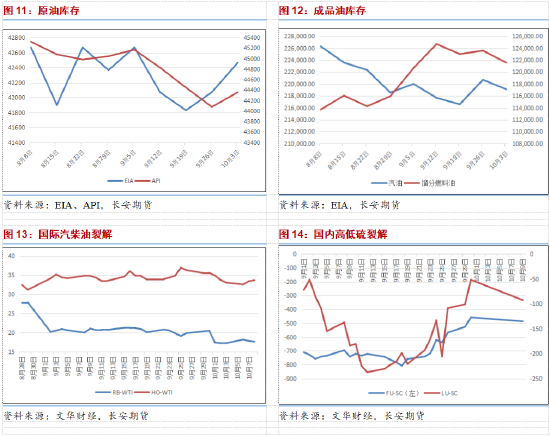 库存侧,方面,美国至10月3日当周API原油库存录得278万桶,预期225万桶,前值-367.4万桶;同时10月3日当周EIA原油库存同步录得371.5万桶,预期188.5万桶,前值179.2万桶,且其中SPR录得2022年10月7日以来最高。本轮库存数据出现了一定程度的积累,且累库幅度也超出了市场预期,核心原因是美国近期原油产量的增加,同时消费表现有所下降所致,这样的客观现实进一步压制了市场对于后续需求回暖的预期,或持续成为油价的拖累因素之一。在成品油方面,美国至10月3日当周汽油库存则录得为汽油库存-160.1万桶,预期-91.1万桶,前值412.5万桶;同时精炼油库存录得为-201.8万桶,预期-117.6万桶,前值57.8万桶。从成品油的角度来看,库存的下降主要是由于美国炼厂产量近期的下滑,且在市场消费转向去汽生柴的当下,整体表现或导致油价更加承压,进而同步对成品油的裂解表现形成压制。
