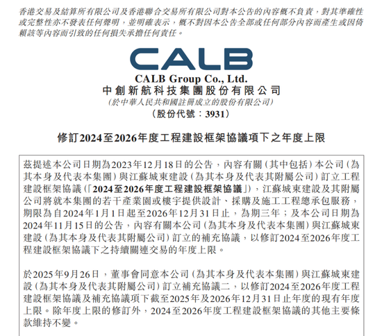 该公司宣布,鉴于业务快速发展及扩产计划需要,董事会已订立《2024至2026年度工程建设框架协议之补充协议二》,决定大幅上调2025-2026年与江苏城东建设的年度工程款上限,2025年、2026年从原7000万元分别提升至2.5亿元、4.6亿元,增幅分别为257%、557%。