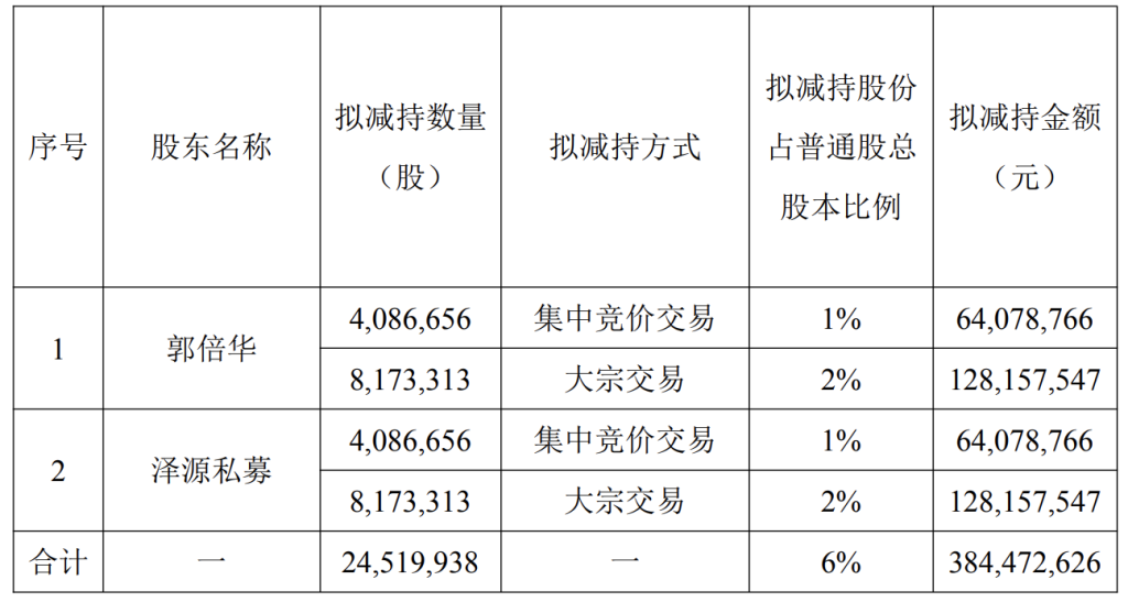 郭倍华、泽源私募计划自本公告披露之日起15个交易日后的三个月内,即2025年11月3日起至2026年2月2日止,均分别以大宗交易方式减持公司股份不超过8173313股(不超过公司目前总股本的2%)和以集中竞价交易方式减持公司股份不超过4086656股(不超过公司目前总股本的1%)。