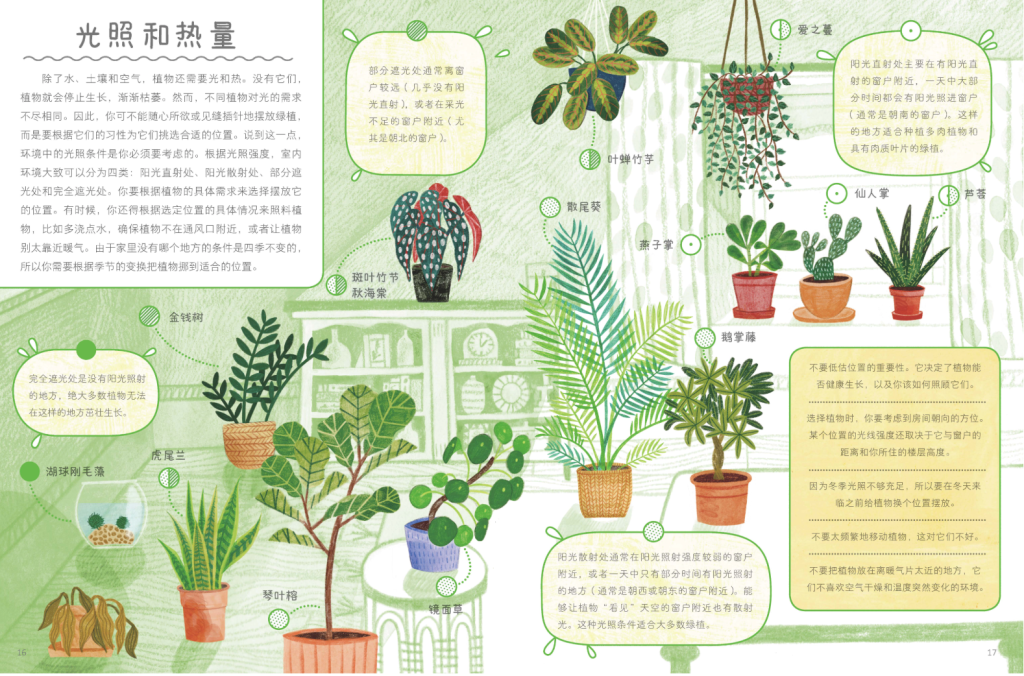 《绿植怎样养不死》是一本面向儿童的植物科普书,不过它所蕴含的实用知识,同样适用于各个年龄段的读者。书中对绿植养护的方方面面进行了细致地讲解,从最初如何挑选适合的绿植品种,到遇到烂根等紧急状况时的急救方法;从根据不同绿植需求选择合适的光照环境,到依据季节变化进行科学管理;从换盆的正确技巧,到虫害的早期预警,内容较为全面。