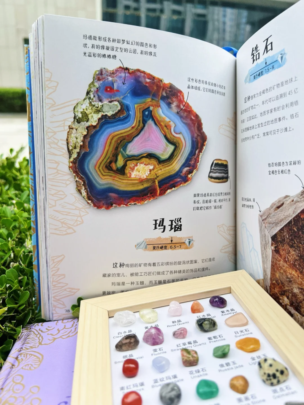 《DK璀璨的矿物与岩石》这本书从光彩夺目的钻石,到路边毫不起眼却暗藏玄机的小石头全部收录。书中159幅高清照片,将矿物与岩石的细节不断放大,为孩子们提供了显微镜级别的科普内容。在书中孩子们能了解到长着多彩“年轮”的玛瑙,发出幽幽磷光的方解石,地壳的重要“角色”花岗岩,“逃离地球”的太空宝石玻璃陨星等。孩子们会发现繁星不止天上有,每一粒沙子都是微缩的宇宙。