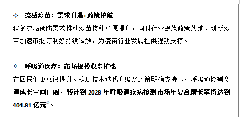 根据世界卫生组织统计,每年约有10亿例季节性流感病例,包括300万至500万例重症病例①。入秋后温差增大,流感、支气管炎等呼吸道疾病进入高发期,居民健康防护需求显著上升,带动医疗健康细分赛道热度攀升。