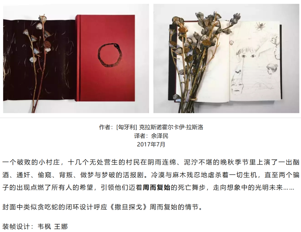 补充说明,《撒旦探戈》的封面装帧设计师是我社的美编室主任、金牌设计师韦枫老师,他曾经设计过不少让人眼前一亮的好书封面,获奖无数。