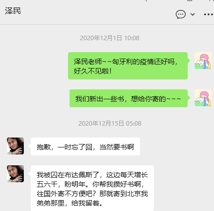 布达佩斯时间与北京时间的时差是6小时,他在当地时间的晚上11点多回复了我的消息,并预告了接下来将要回国为拉斯洛的两本新书《温克海姆男爵返乡》《赫尔施特07769》做一系列推广活动。