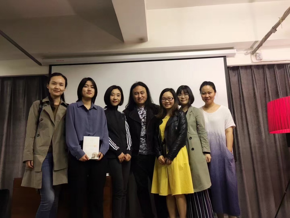 2018年春,余泽民携译著《撒旦探戈》《烛烬》与作家鲁敏在先锋书店做分享活动。左起第四个:余泽民,第五个:本文作者徐琼玉,最后一位:《撒旦探戈》责任编辑王珏