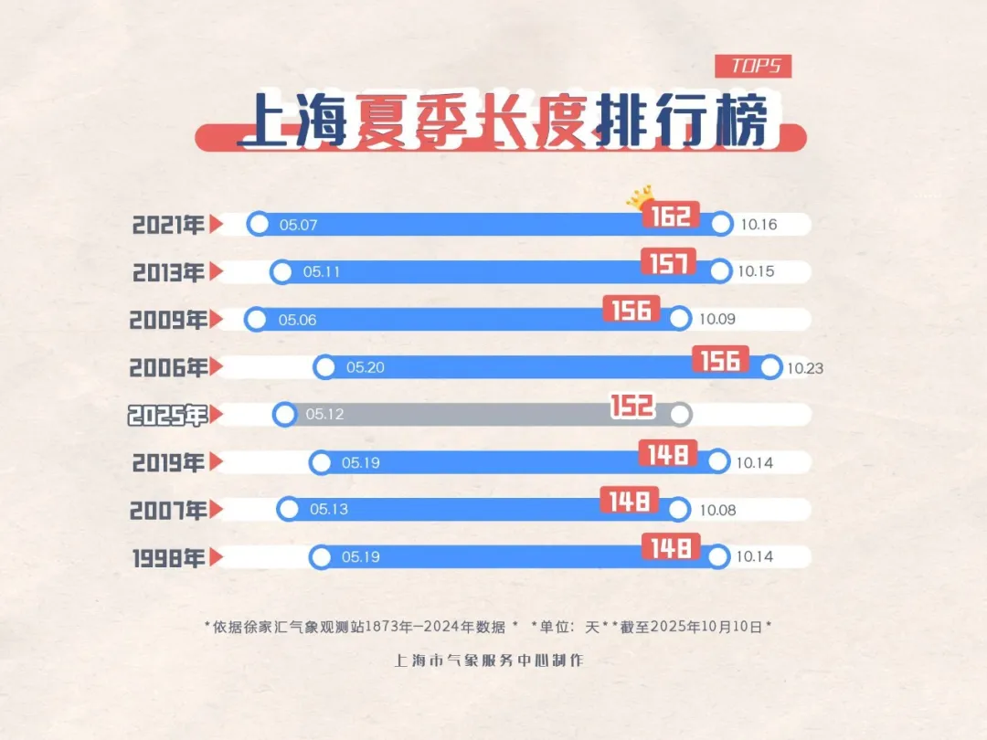 根据徐家汇站数据统计,上海常年平均夏季长度约为134天,史上最长夏季为2021年的162天。今年夏季已达152天,跻身历史第四高位。根据目前预报来看,进入历史前三位毫无悬念。