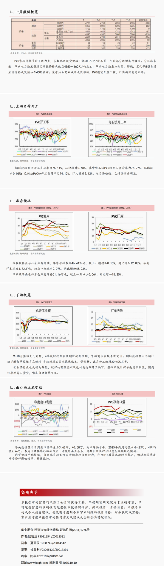 ③ V产业链库存前期低价去库、提价累库现象失效,低价阶段下库存累库延续,这也是拖累行情的最大因素。出口端仍是最大消纳动力,但海外反倾销税等环节边际影响出口节奏,美联储9月降息25bp落地,本月聚焦10月底二次降息幅度。海内外定价权品种节后与内地品种出现较大分化,PVC金九银十需求端基本落空,低价流通难抵库存连增,多重压力下空头主导市场。