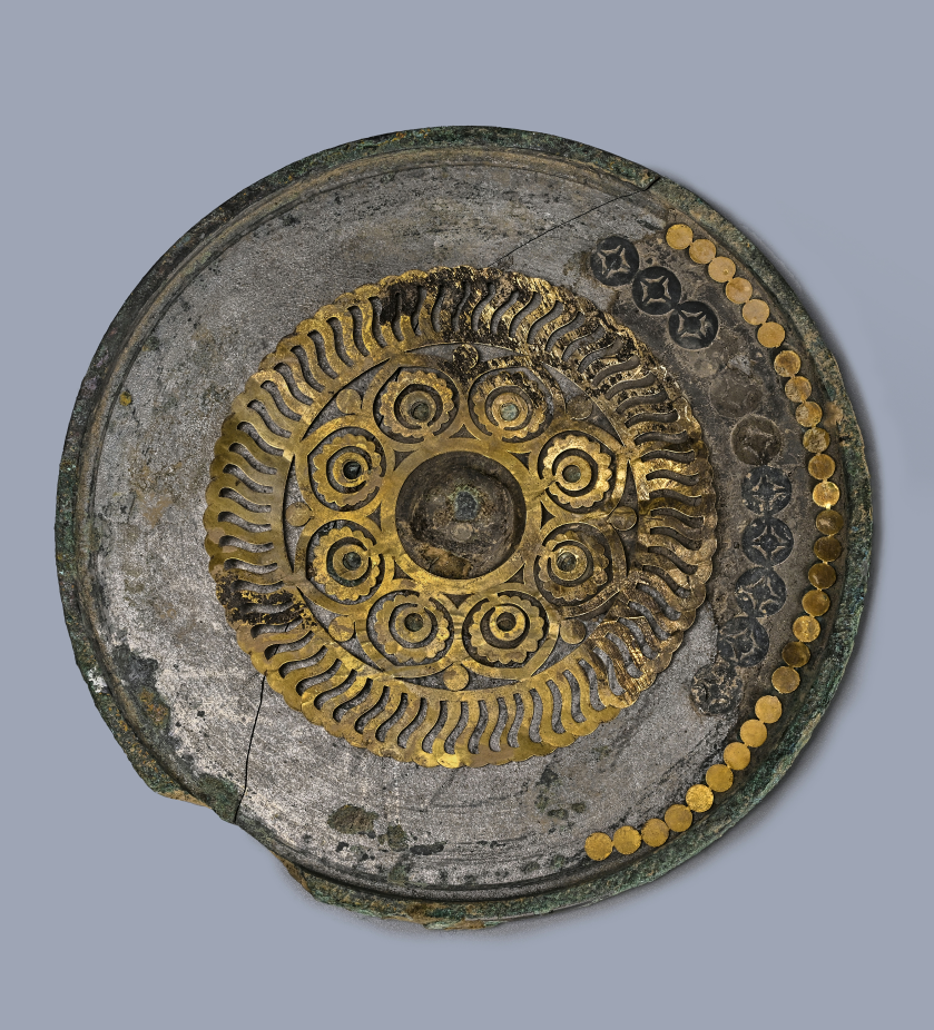 用天然贝壳制作而成。表面粘贴有银质叶状图案,呈黑色,背面有褐色斑纹。据考古专家推测,随葬器物中的这些装饰品及其图案和材质,可能体现了墓主个人的喜好。