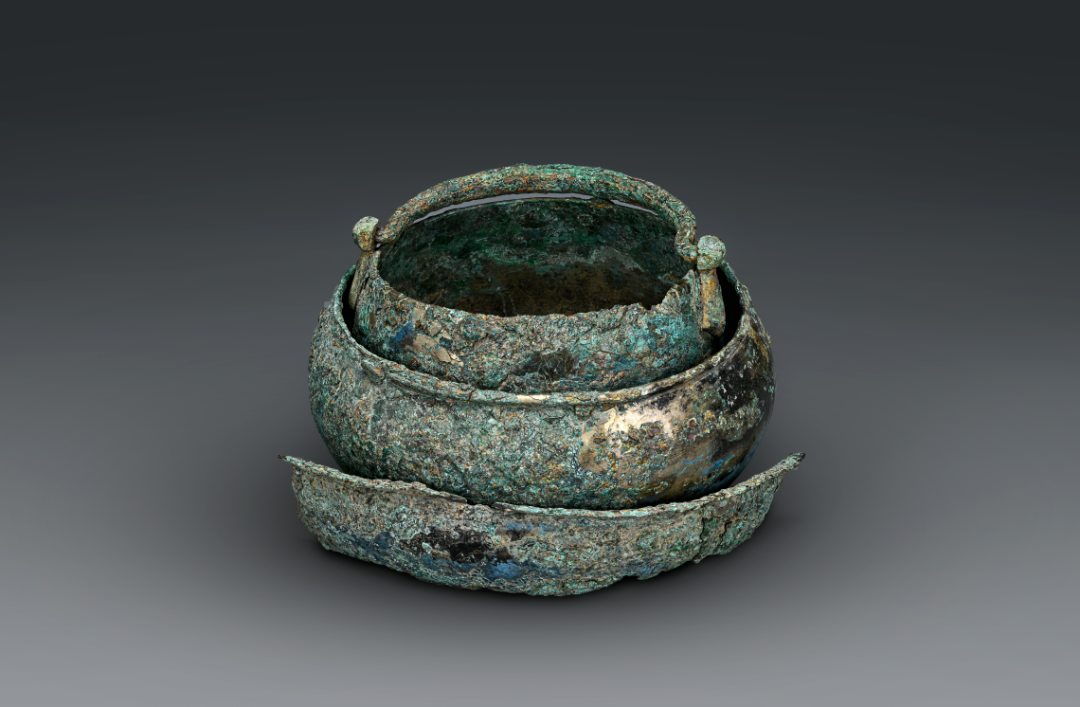提梁罐、钵及盆3件器物出土时,自上而下依次叠置。
