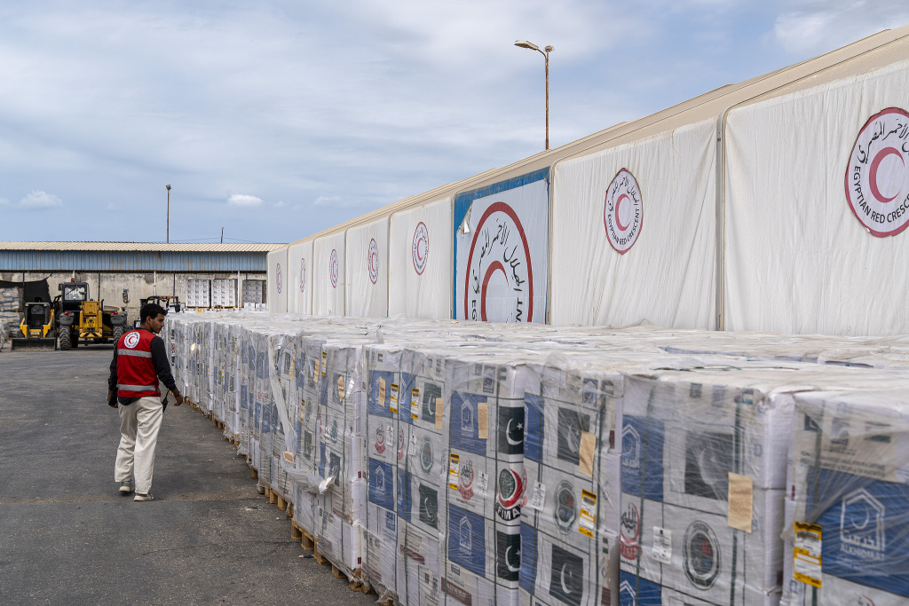 当地时间2025年10月9日,埃及阿里什,拉法口岸附近的援助仓库,工作人员正在清点援助物资。视觉中国 图