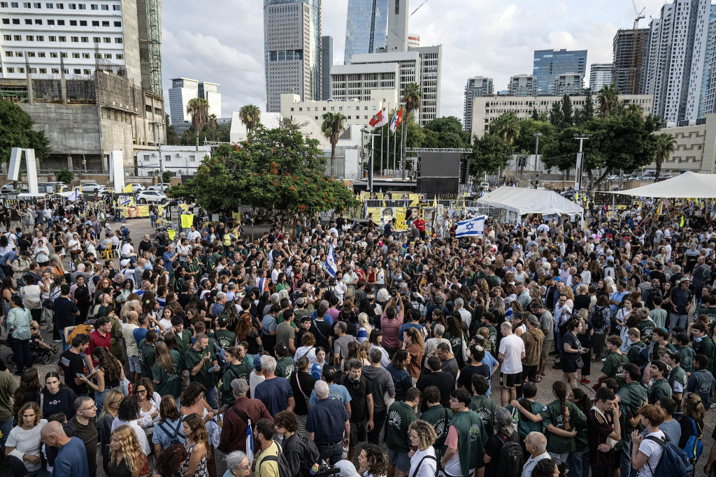 当地时间2025年10月9日,以色列特拉维夫,大量以色列民众聚集在广场,庆祝达成停火协议。视觉中国 图