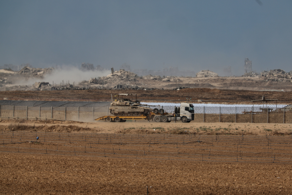 当地时间2025年10月9日,加沙地带,一辆以色列军用卡车正在装运坦克撤离。视觉中国 图