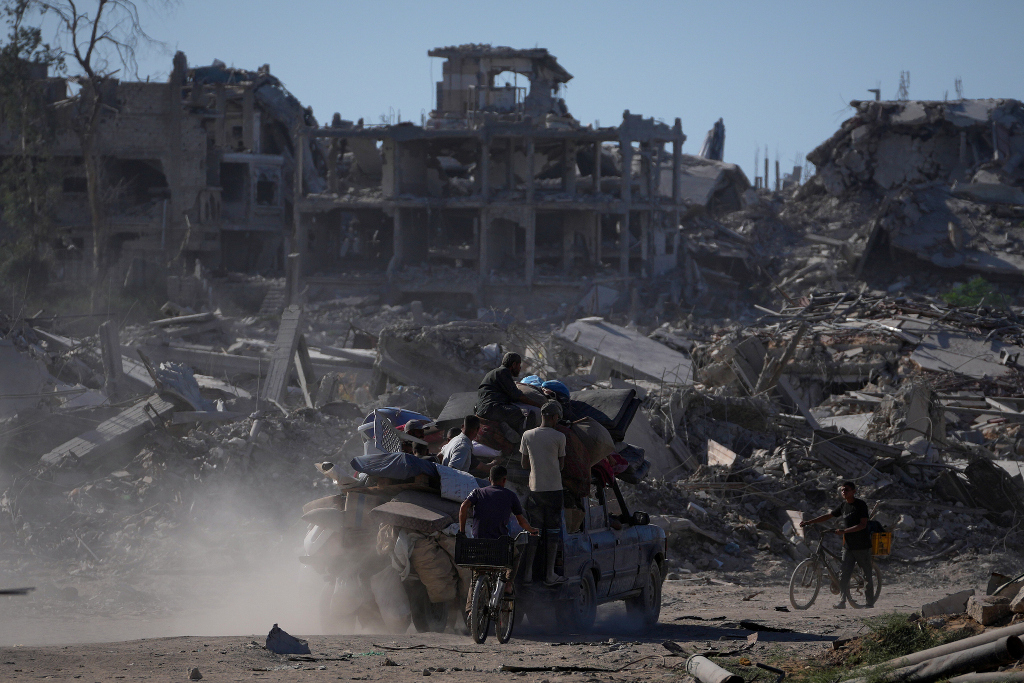 当地时间2025年10月10日,加沙城,以色列和哈马斯同意暂停冲突并释放剩余人质后,流离失所的巴勒斯坦人将物品装载到卡车上,返回家园。视觉中国 图