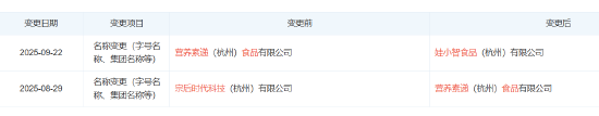 此外,公司曾进行两次更名,2025年8月29日,公司名称由“宗后时代科技(杭州)有限公司”变更为“营养素递(杭州)食品有限公司”,9月22日,名称变为“娃小智食品(杭州)有限公司”。