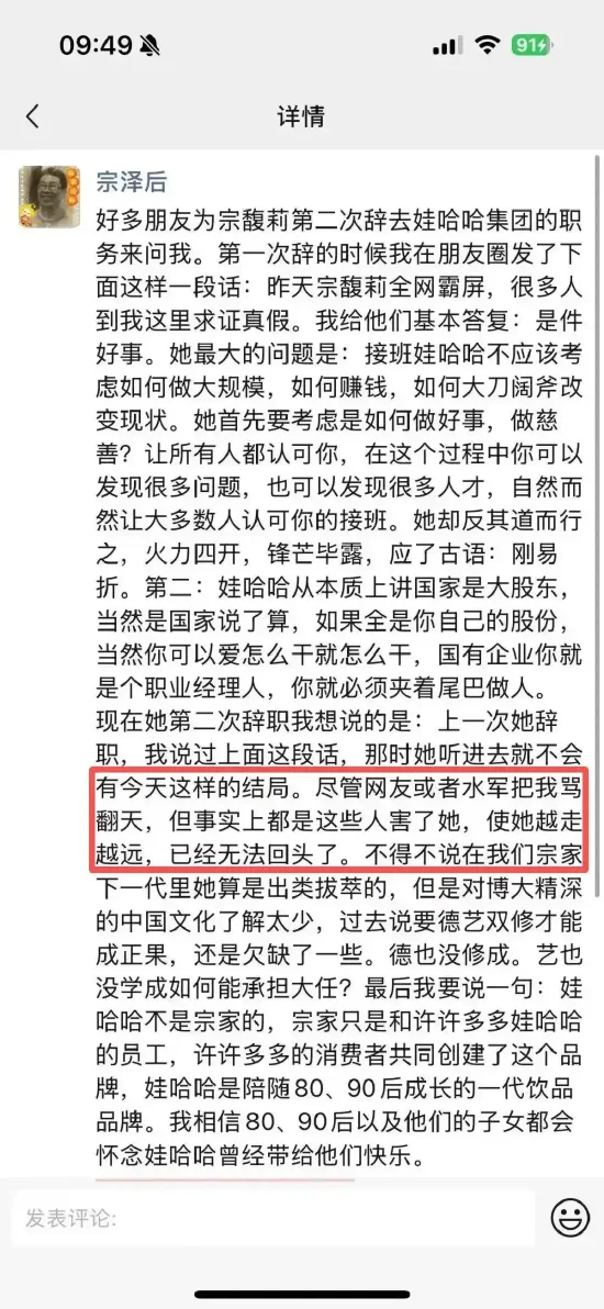 10月11日,宗馥莉的叔叔宗泽后在朋友圈发声表示:“尽管网友或者水军把我骂翻天,但事实上都是这些人害了她,使她越走越远,已经无法回头了。不得不说在我们宗家下一代里她算是出类拔萃的,但是对博大精深的中国文化了解太少,过去说要德艺双修才能成正果,还是欠缺了一些。德也没修成。艺也没学成如何能承担大任?”