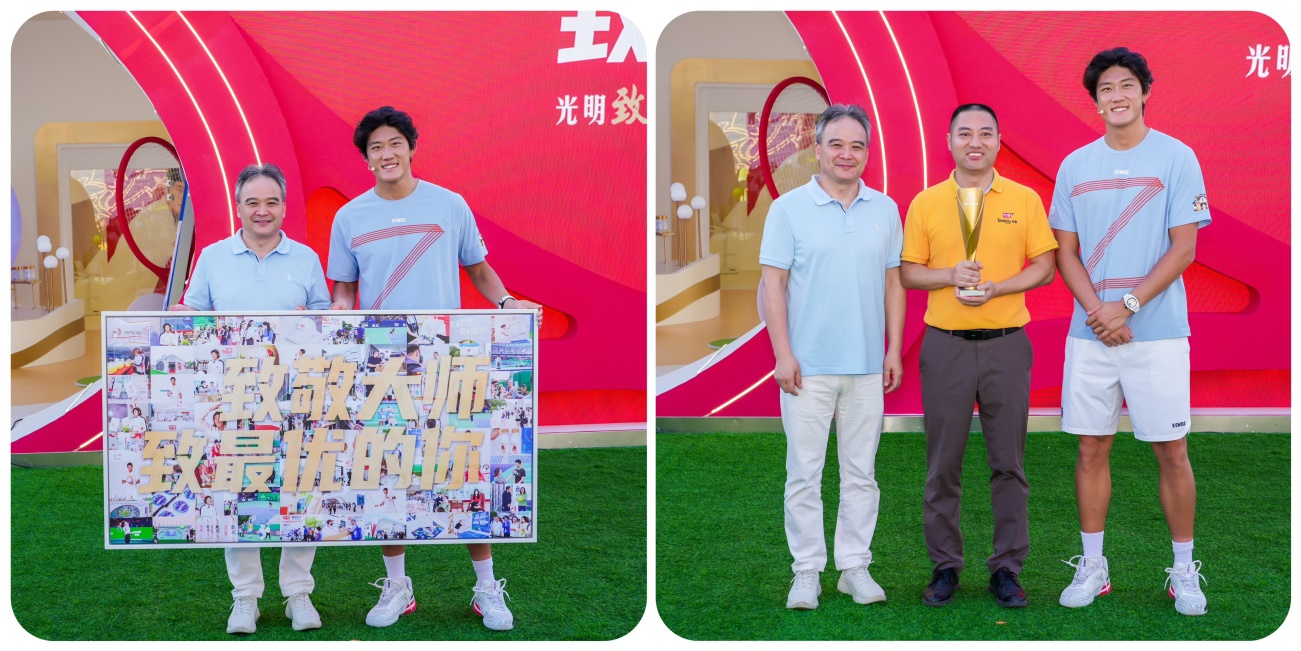 这份因光明而生的温暖,亦在消费者与合作伙伴间持续流转。致优奶粉品牌经销商代表,以及从首届光明健康生活节中脱颖而出的光明随心订幸运消费者受邀莅临现场,并分别登台分享了与光明跨越时光的联结故事——从长期信赖的合作情谊,到日常相伴的消费记忆,让品牌与合作伙伴、消费者的情感纽带愈发真切可感。为回馈经销商伙伴长久以来的信任与同行,黄黎明亲自为其颁发“尊耀合作伙伴”奖杯,“光明鲜活大使”张之臻同步送上亲笔签名网球。这份特别致意,既是以赛场上的拼搏精神,呼应光明乳业百年来对品质的坚守,更见证了双方携手共进的深厚情谊。