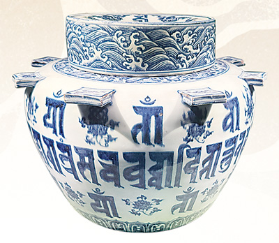 明宣德青花蓝查体梵文出戟盖罐 明宣德青花蓝查体梵文出戟盖罐和在它旁边展出的乾隆铭铜嘉量之间,有一段特别的“故事”。故宫博物院藏《是一是二图》描绘了身着汉装的乾隆皇帝,坐榻周围放着他收集的各种文物。其中,新莽铜嘉量和明宣德青花蓝查体梵文出戟盖罐分别位于屏风左右,十分显眼。两件文物于1933年共同踏上南迁之路,1945年抗战胜利后,它们重聚南京。此后,这件出戟盖罐重回北京故宫,新莽铜嘉量则入藏台北故宫博物院。但乾隆皇帝参照它设计、制造的“乾隆嘉量”,至今仍陈设在故宫的重要宫殿前。 故宫文物南迁,是故宫博物院的一段峥嵘岁月,也是中华民族的一段抗争历史。从宏伟壮丽的殿宇楼阁到华洋共处的租界洋房,从钢筋铁骨的现代库房到军民同守的山间洞穴和乡野祠堂,文物南迁历时二十余载,行程数万里,社会各界仁人志士为守护中华文化根脉,留下了许多感人的真实故事和珍贵的历史记忆。