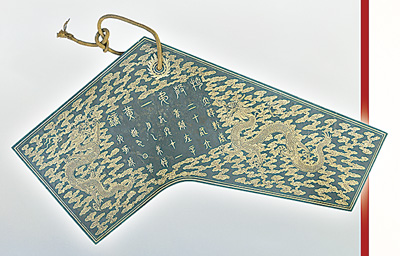 青玉描金云龙纹特磬 这是整个展览的最后一件文物。清代平定准噶尔后,玉路畅通、玉贡不绝。乾隆二十四年(1759年),江西出土古钟,供入朝廷,定为镈钟。乾隆二十六年(1761年),仿出土古钟形制新铸镈钟,并添配特磬,以求金声玉振、礼乐完备。特磬有12件,采用整块新疆和田青玉琢磨而成,莹润光洁,两面饰以描金双龙戏珠和流云纹。这次展出选择了特磬中的第三件,名曰“太簇”,有万物生长之意,寓意故宫博物院下一个百年的全新开始。