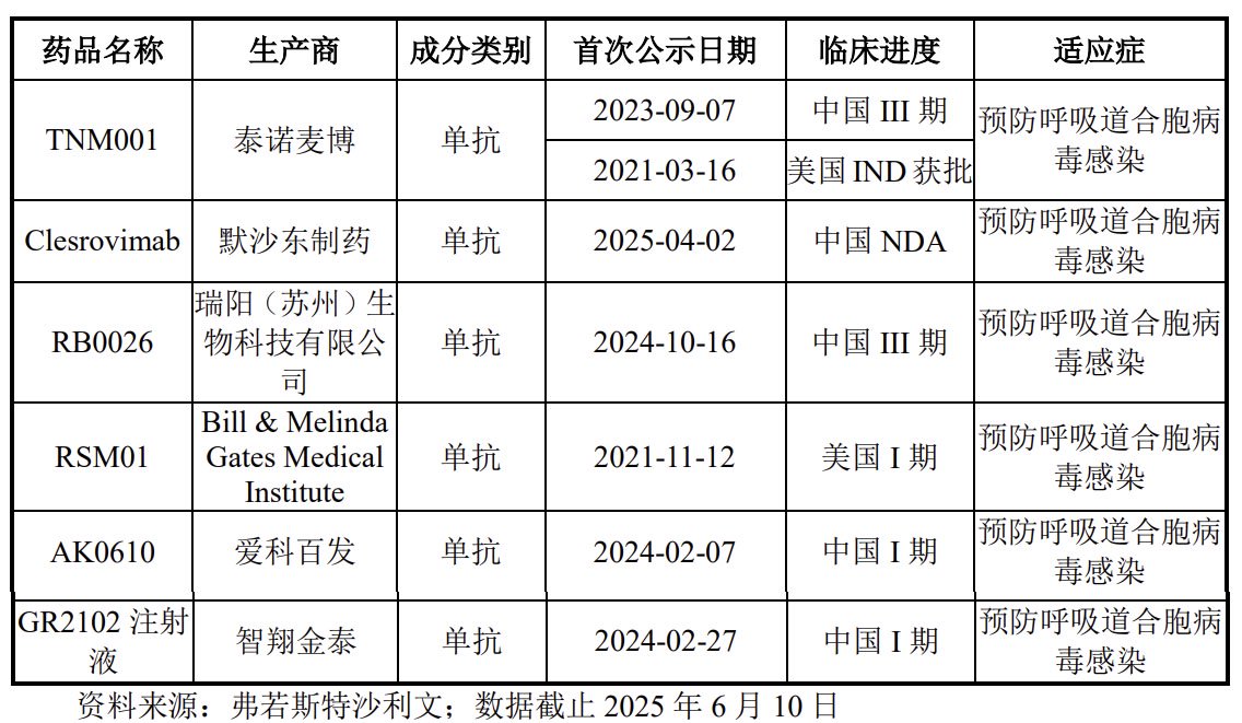 进口势力之外,国内当前已有多家企业加速布局RSV单克隆抗体研发,代表产品包括泰诺麦搏的TNM001、瑞阳生物的RB0026、爱科百发的AK0610、的(688443.SH)GR2102注射液。这几款产品中,又以TNM001和RB0026的研发进展最为领先,均已处于三期临床阶段。