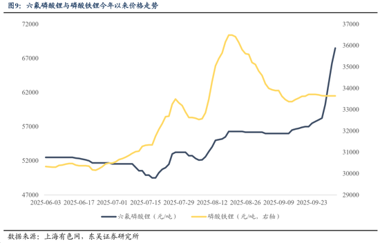 储能装机与动力电池需求超预期高增,同时上游原材料涨价拖高成本曲线,政策反内卷定调下电芯出厂报价上涨。从上游成本端看,碳酸锂价格上涨率先带动正极铁锂、电解液等电芯主要原料价格上涨;而电芯需求扩张反向拉动对应原料(正极铁锂、电解液、电池隔膜)价格进一步抬升:截止10月10日正极磷酸铁锂最高价已趋近40000元/吨;电解液六氟磷酸锂现货价格已攀升至62,500-68,400元/吨,均价65,500元/吨,较10月9日上涨3000元/吨;8月初干法隔膜提价10%,截止9月11日电池湿法隔膜回升至每平方米0.5-0.55元。同时,电芯下游动力与储能电池需求同步放量:2025年1-5月份,动力电池销量同比增长56.2%;储能电池2025年受海内外电力需求增长影响进入抢装阶段,全球出货量跃升,上半年出货量同比增长115.2%。而储能电芯供应紧张将长时间延续,头部企业满产满销,订单排期长。原料成本抬高挤压利润空间与电芯需求快速走扩后,电芯厂商随即提高电芯出厂报价,截止9月5日,当前314Ah方形磷酸铁锂储能电芯价格区间为0.272元-0.342元/Wh,均价约0.307元/Wh;280Ah、100Ah电芯均价分别约为0.303元/Wh、0.362元/Wh,环比一周前(8月29日)出厂报价均略升。未来短期内,由于头部电芯企业扩产周期较长,新产能释放滞后,导致短期供需失衡将延续,电芯价格或继续保持上涨趋势。