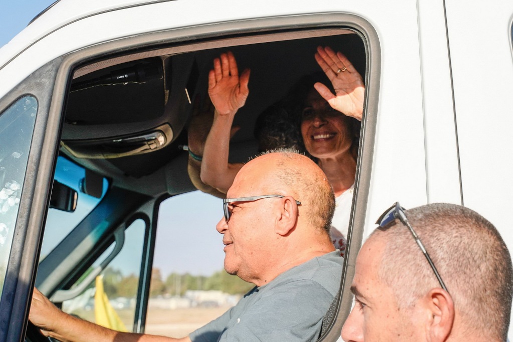 10月13日,以色列南部,以色列被扣押人员尼姆罗德·科恩的母亲维姬·科恩(上)在哈马斯释放人质后抵达雷姆军事基地,她从车中向外挥手。
