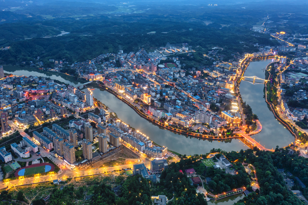 建宁在农业、交通、教育等领域广泛使用数字化技术,图为建宁县城夜景。    视觉中国 图