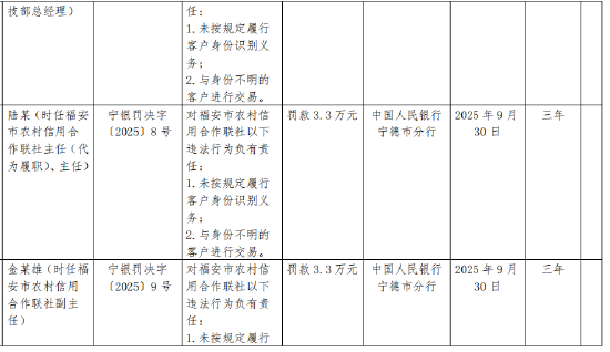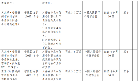 同时,王某辉(时任福安市农村信用合作联社风险部征信异议核查岗员工)对福安市农村信用合作联社未按规定标注异议信息的违法行为负有责任,被罚款1.5万元。黄某芳(时任福安市农村信用合作联社财务会计部总经理)对福安市农村信用合作联社以下违法行为负有责任:未按规定履行客户身份识别义务、对异常账户的交易监测及管控不到位,被罚款3.7万元。吴某清(时任福安市农村信用合作联社主任、理事长(代为履职)、理事长)对福安市农村信用合作联社未按规定标注异议信息的违法行为负有责任,被罚款1.5万元。王某(时任福安市农村信用合作联社信息科技部总经理) 对福安市农村信用合作联社以下违法行为负有责任:未按规定履行客户身份识别义务、与身份不明的客户进行交易,被罚款3.2万元。陆某(时任福安市农村信用合作联社主任(代为履职)、主任)对福安市农村信用合作联社以下违法行为负有责任:未按规定履行客户身份识别义务、与身份不明的客户进行交易,被罚款3.3万元。金某雄(时任福安市农村信用合作联社副主任)对福安市农村信用合作联社以下违法行为负有责任:未按规定履行客户身份识别义务、与身份不明的客户进行交易,被罚款3.3万元。