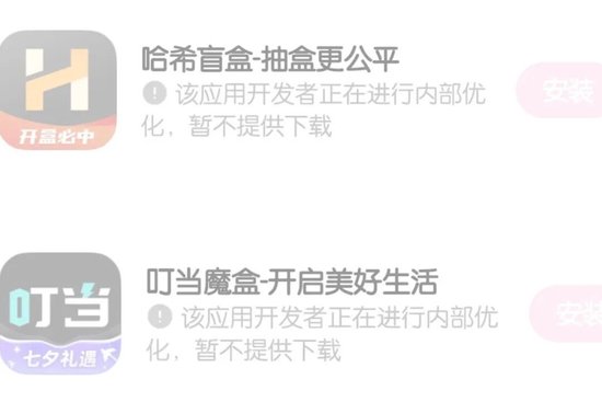 映客通过不同子公司来运作盲盒业务,如“哈希盲盒”由海南凯音网络科技有限公司(简称“凯音”)推出,“叮当魔盒”由海南爱客网络科技有限公司(简称“爱客”)推出等。目前,这两款APP在手机端APP商店中仍能搜出,但均显示“该应用开发者正在进行内部优化”,无法下载。