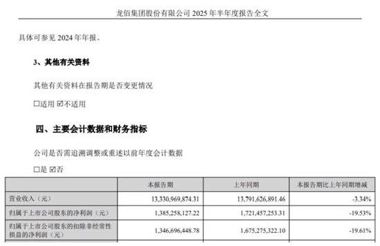 2025年上半年,龙佰集团的归母净利润同比下降19.53%至13.85亿元,扣非后净利润同比下降19.61%至13.47亿元,主要是钛白粉价格下降所致。